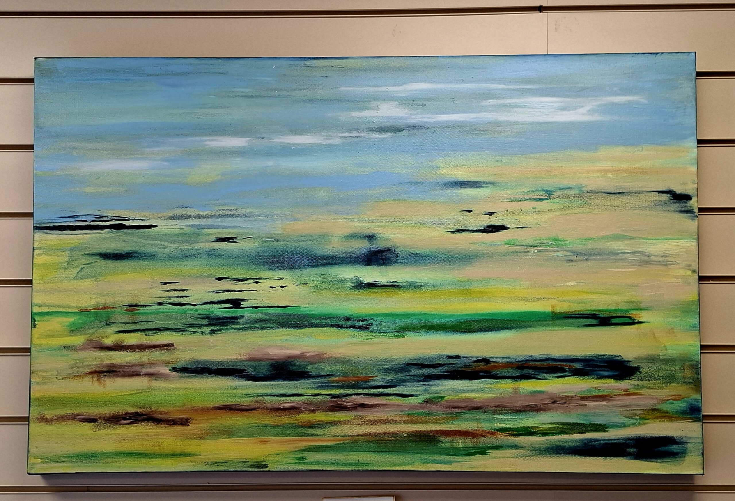 An abstract landscape where soft hues of blue, green, and yellow blend seamlessly with darker accents, evoking the shifting light and mood of early evening. The textured layering adds depth, inviting viewers to interpret the scene’s subtle transitions and movement. This piece conveys a tranquil yet dynamic atmosphere, making it a thoughtful addition to any space seeking a touch of calm and color.