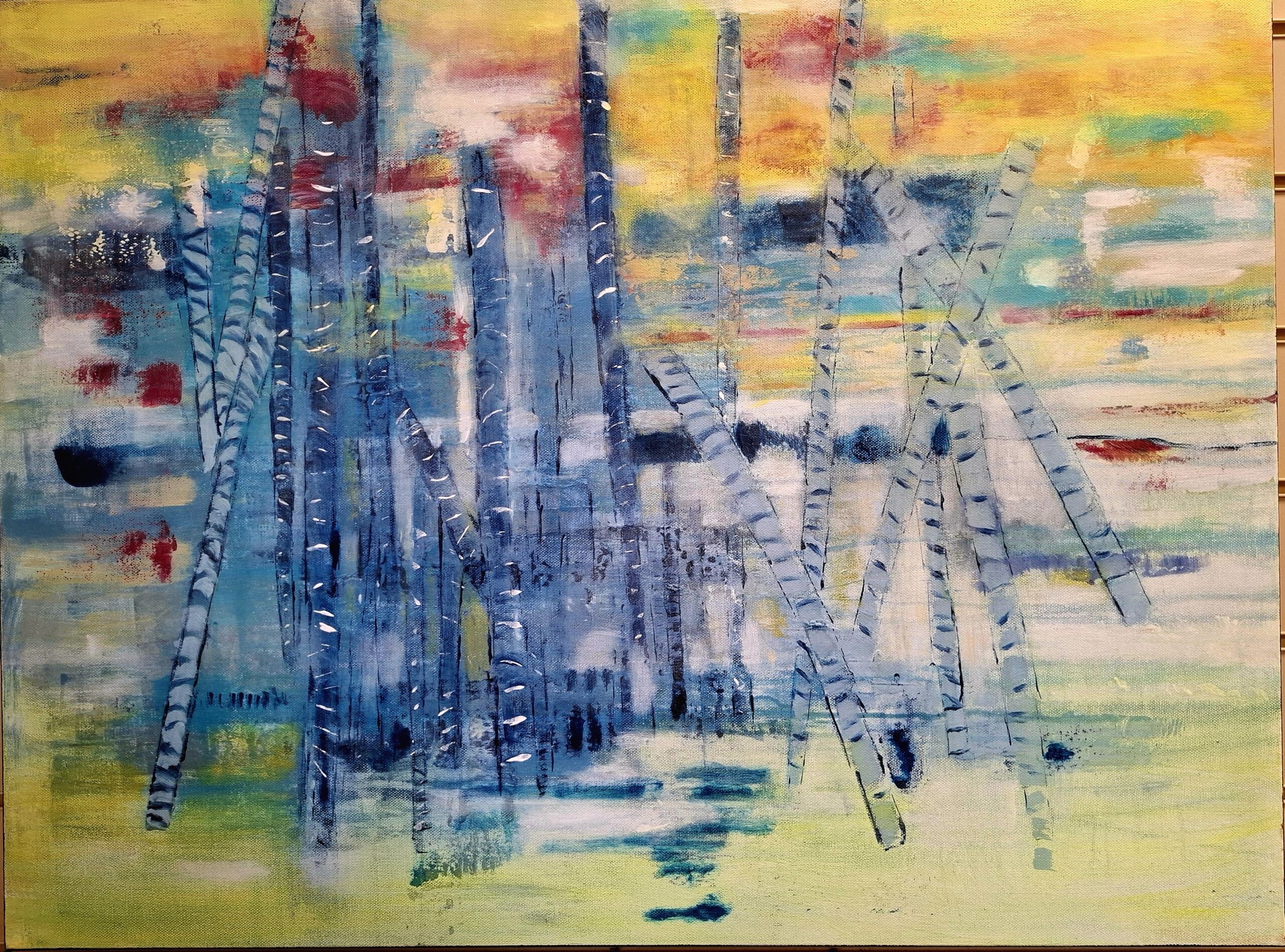 Colorwoven Grove presents an abstract interpretation of a forest, where elongated tree forms emerge through layered textures and intersecting lines. Cool blues and muted greys contrast with warm yellows and splashes of red, conveying a dynamic interplay of light and shadow. This piece reveals a rhythmic pattern that evokes the quiet complexity of nature, making it an engaging focus for any room.