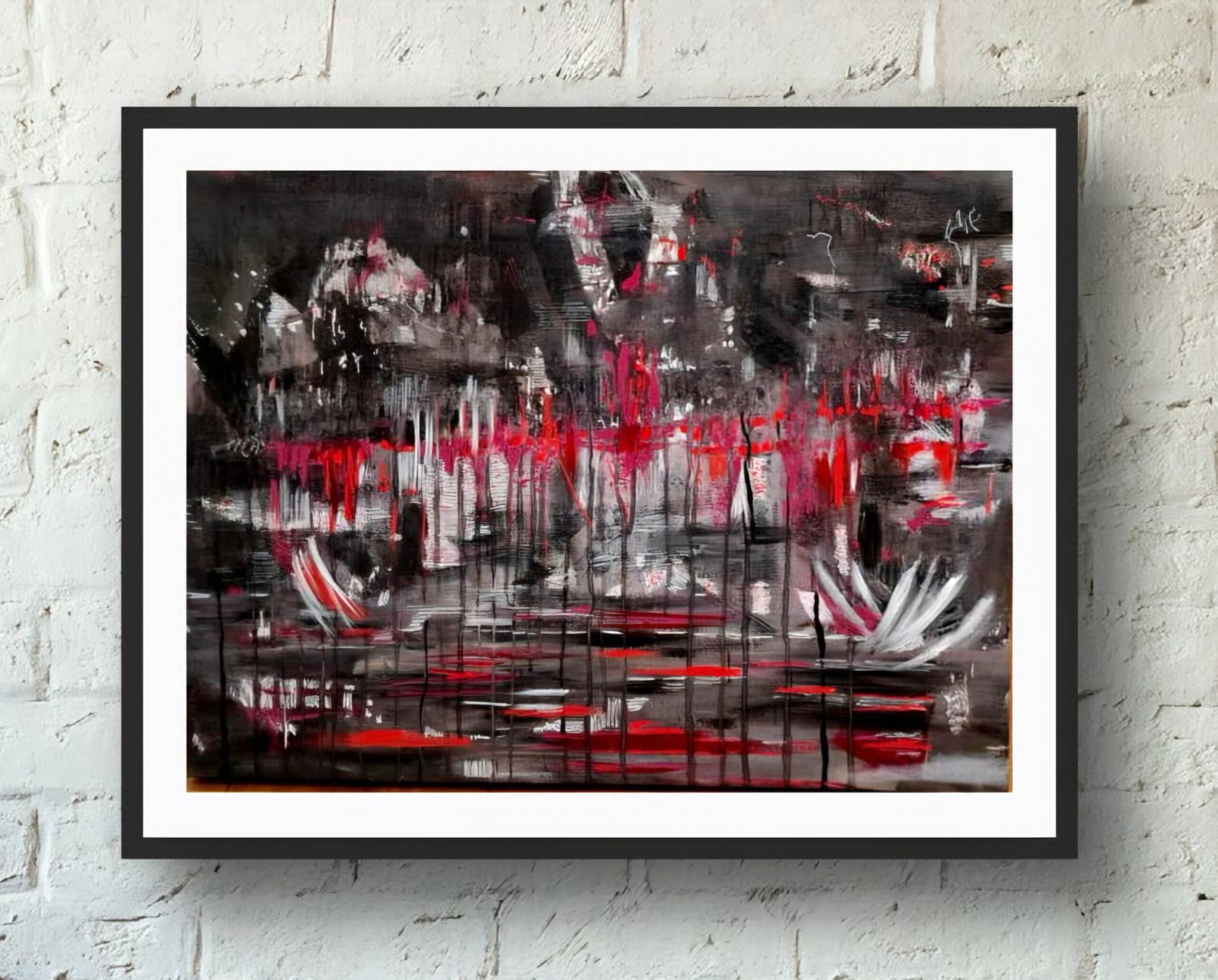 A bold dark setting for this deliberately limited colour palette painting. Drips and flashes of colour blend with intricate marks conveying multiple activities in a night time urban environment.