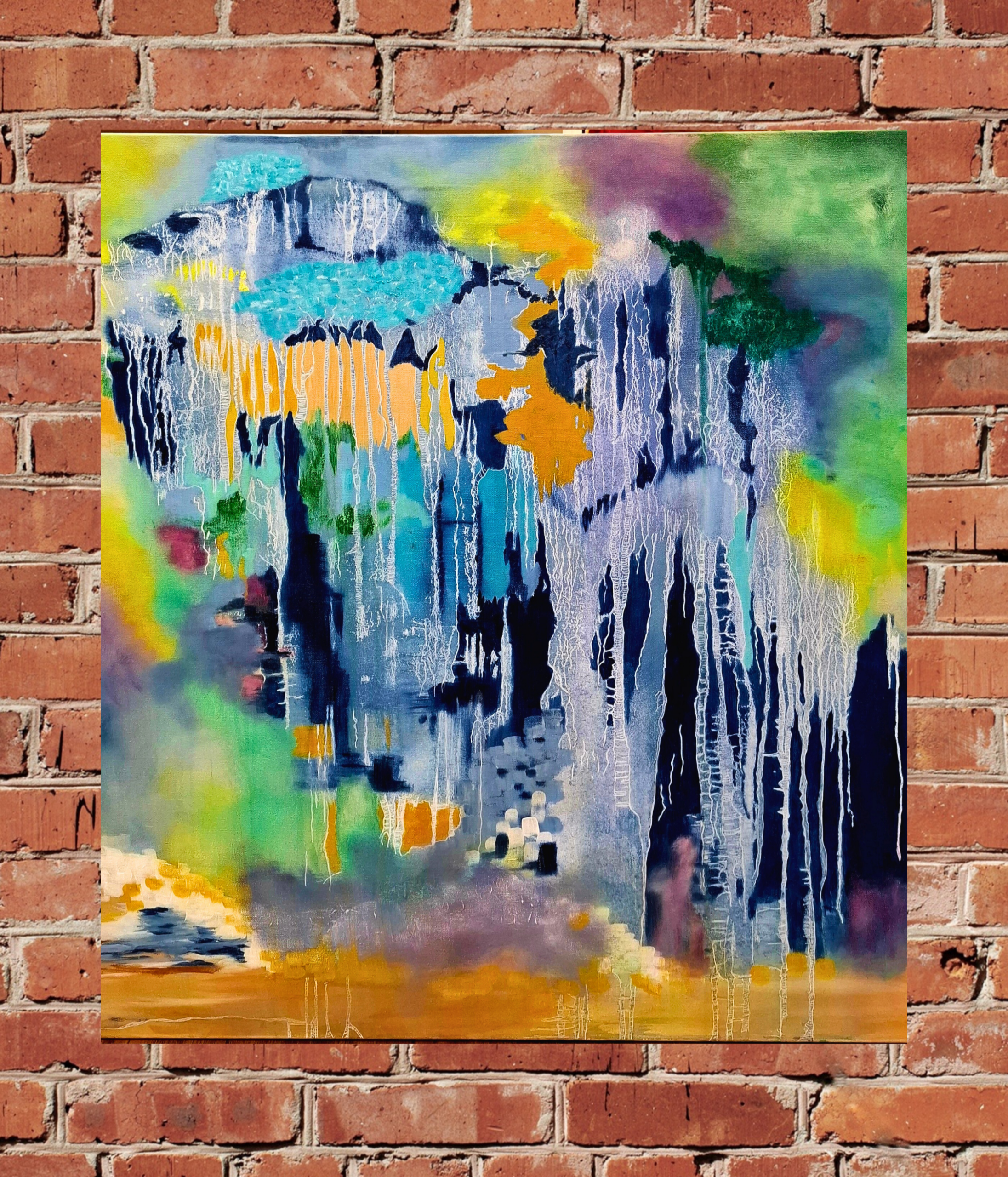 This striking work incorporates blues and greens blended with sunny yellows showcasing an interior of cascading suspended botanical like images..
