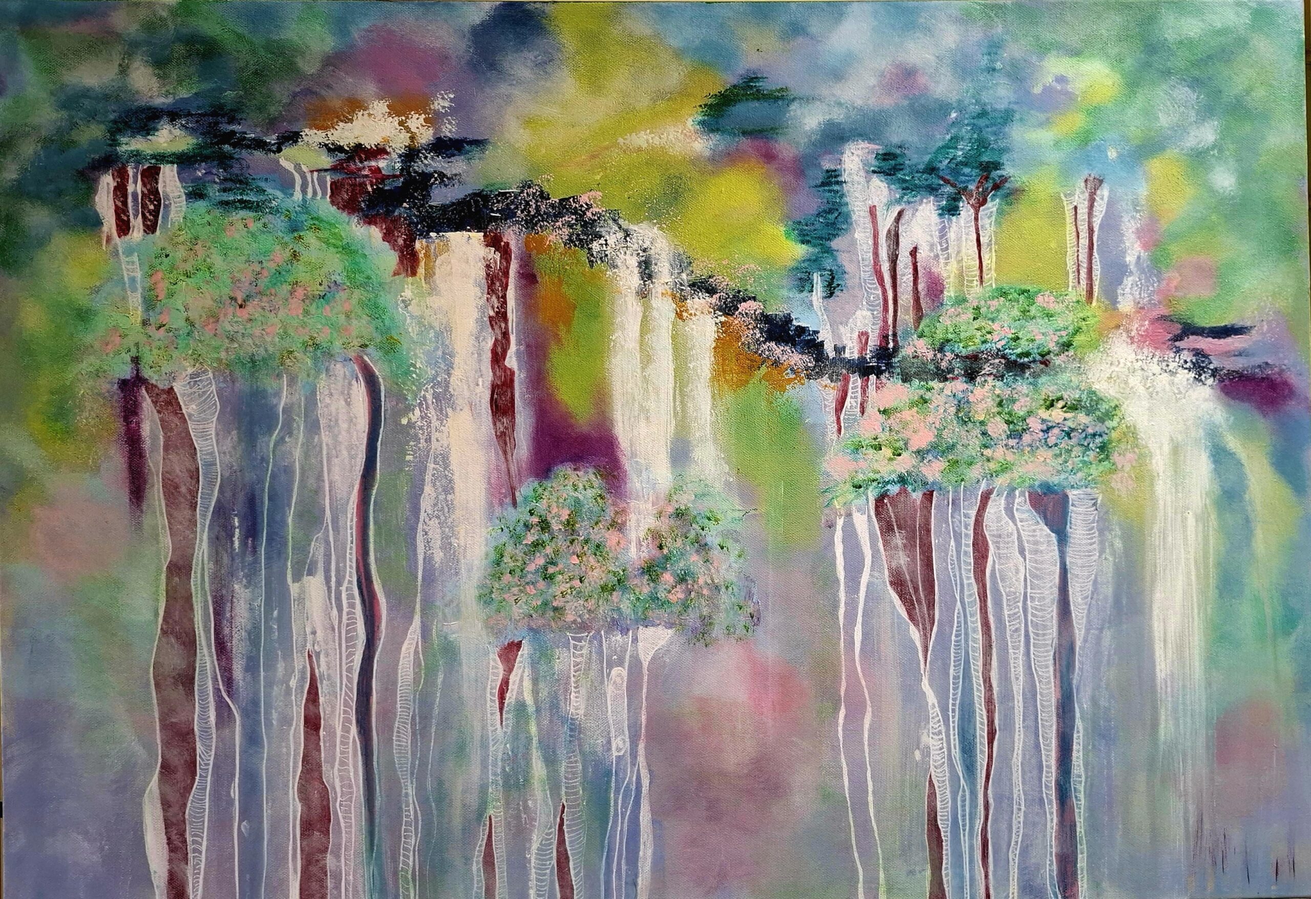 Delicate waterfalls flow softly alongside clusters of leafy trees. The interplay of cool blues, vibrant greens, and subtle pinks creates a dreamlike atmosphere that invites quiet reflection. The fluidity and lightness in the composition reveal a serene moment suspended in time. A refined addition that brings calm and intrigue to any space.