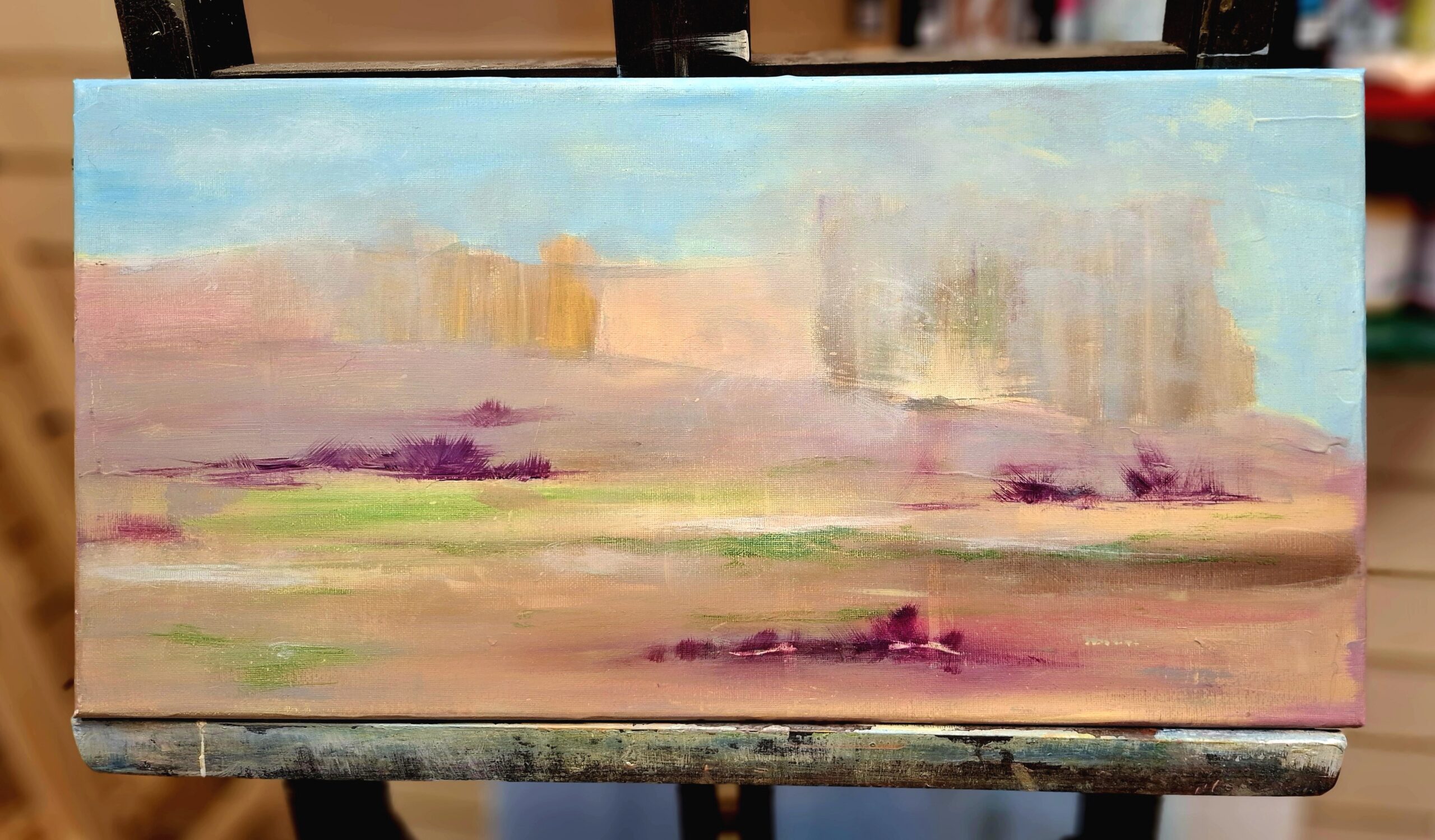 This small abstract landscape painting presents a serene vista with soft pastel tones blending seamlessly into one another. Hints of muted greens and purples emerge from the gentle earth tones, suggesting delicate bursts of natural life. The airy sky fades quietly into the horizon, evoking a sense of calm and subtle movement.